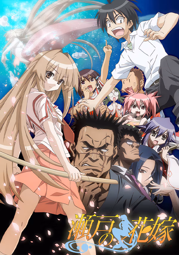 『瀬戸の花嫁』は2007年放送のTVアニメ。原作は木村太彦による漫画(ガンガンWINGコミックス/スクウェア・エニックス刊・全16巻)。舞台は瀬戸内海——溺れた高校生・満潮永澄が人魚のヤクザ一家の令嬢・瀬戸燦に救われ、「人魚の掟」により結婚することに。任侠×ファンタジー×学園ラブコメという異色の組み合わせが生み出す爆笑コメディが展開します。GONZO×AIC制作、岸誠二監督、桃井はるこ(燦役)・水島大宙(永澄役)・野川さくら(留奈役)ら豪華声優陣、SUN&LUNARのOP主題歌「Romantic summer」が作品を彩ります。ハイテンションなギャグとパロディ満載、ツッコミどころ満載のキャラクター達が織りなす青春ラブコメディの名作です。
