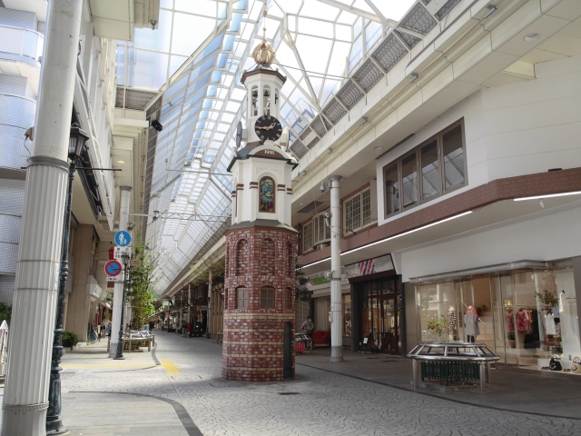 表町商店街は全長約900メートルのアーケードで、推し武道のスポットを雨に濡れず巡れます。